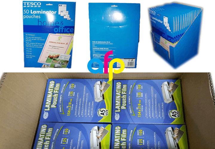 光沢のあるポリエステル PET袋ラミネートフィルムは125ミクロン (厚さ) とA4 (幅216mm*303mm) のサイズで最も人気があり,文書や写真保護に使用されています.